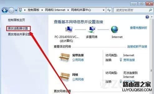 4.在網(wǎng)絡(luò)和共享中心設(shè)置窗口里點(diǎn)擊“更改適配器設(shè)置” 如圖
