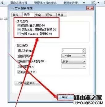 6.在寬帶連接屬性設(shè)置窗口里點(diǎn)擊“選項(xiàng)”,然后把撥號(hào)選項(xiàng)那里的3個(gè)勾給去掉, 設(shè)置完之后,點(diǎn)擊“確定” 如圖