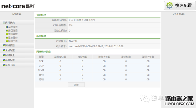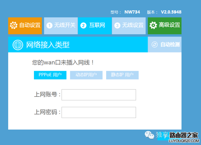進入操作界面,會看到一個快速配置按鈕,點擊進入(一般的都是自動彈出來的)進入上網方式設置,我們可以看到有三種上網方式的選擇,在這里選擇PPPoE(默認選項),輸入寬帶的帳戶和密碼