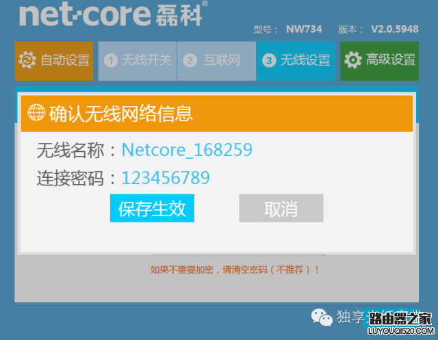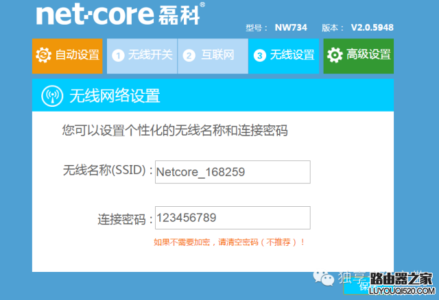 接下來就是無線設置,要輸入無線名稱(ssid),然后設置一個連接密碼,密碼盡量復雜一些一面被破解(建議包含字母和數字),設置完成之后別忘記保存哦。