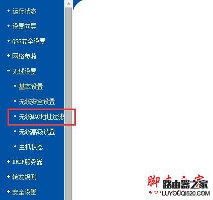 在無線路由器頁面的左側欄目,點擊打開無線設置欄目下的無線MAC地址過濾