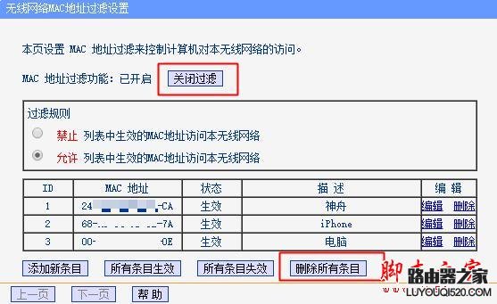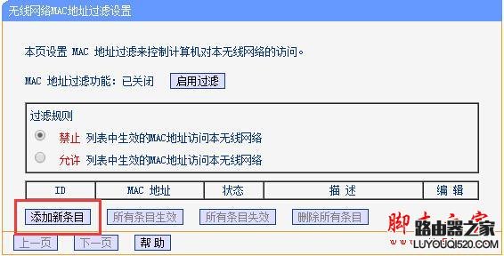 這時,在頁面的右側將有一個無線MAC地址過濾的設置頁面,點擊左下角的添加新條目