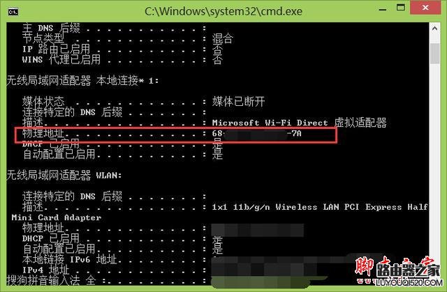 進入cmd運行窗口,輸入ipconfig/all,然后敲一下回車鍵,在無線局域網適配器本地連接下方,便可以看到電腦的物理地址了