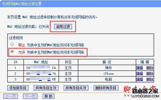 所有設備的MAC地址都添加完畢之后,點擊上方的啟用過濾按鈕,過濾規(guī)則選擇允許列表中的生效的MAC地址訪問本無線網絡,這樣,以后就只有這列表里面的設備可以上無線網,別人知道WiFi密碼了也別想蹭,如果家里有客人來,想上無線網,那么就麻煩一些了,需要將他們的MAC地址添加進去(文末有蘋果、安卓、電腦的MAC地址查看方法)