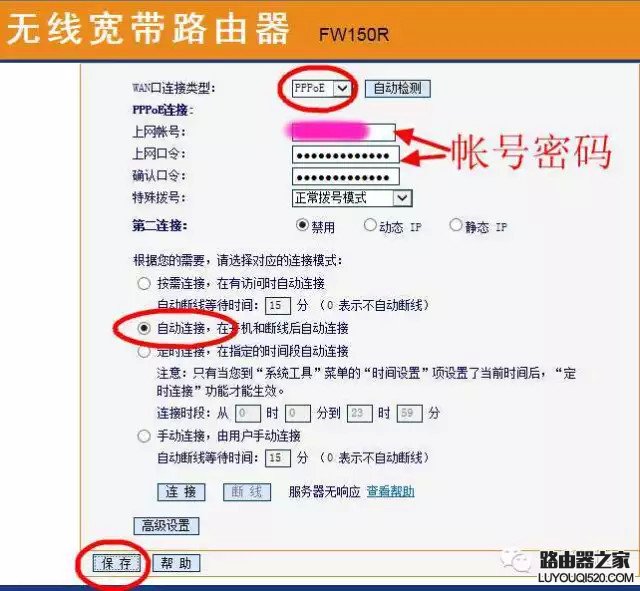 4、選擇“PPPOE”撥號連接上網,并輸入上網帳號密碼點保存。
