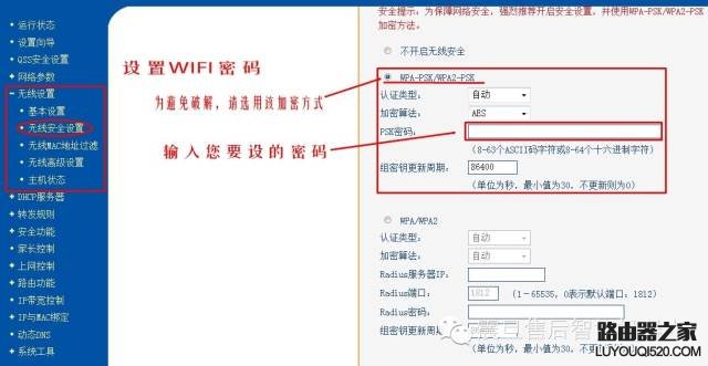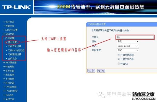 第三步:進(jìn)行WIFI設(shè)置,輸入您想要的wifi名稱(chēng),為避免破解要選擇加密方式,然后輸入您要設(shè)置的密碼