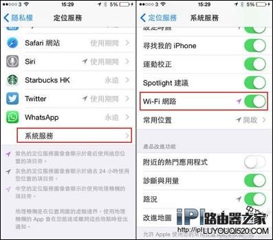 2、然后在設置中繼續點擊【隱私】→【定位服務】→【系統服務】,撥一下 WiFI 網絡關閉 WiFi 定位服務。