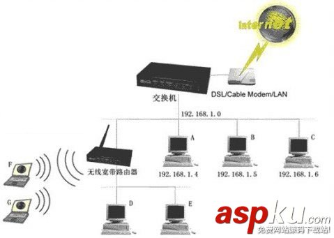 假設(shè)某一網(wǎng)絡(luò)拓?fù)浣Y(jié)構(gòu)如下圖所示,該網(wǎng)絡(luò)使用DSL/Cable Modem/LAN等方式連接到Internet,由Modem或路由器共享Internet連接,內(nèi)部網(wǎng)絡(luò)則通過交換機(jī)連接起來,以實(shí)現(xiàn)多臺電腦接入上網(wǎng)。假設(shè)交換機(jī)已開啟DHCP功能自動分配IP地址,IP段是192.168.1.0,則以太網(wǎng)的電腦A、B、C的IP為192.168.1.x(X為2-255之間任意一數(shù)字,下同),并能正常上網(wǎng)。現(xiàn)在,如果在一個節(jié)點(diǎn)接上無線寬帶路由器,它下面用網(wǎng)線連接了D、E等臺式電腦,以及用無線方式連接了筆記本電腦F、G。怎樣設(shè)置才能保證D,E,F,G同時上網(wǎng)呢?(D,E為有線連接,F(xiàn),G為無線連接)