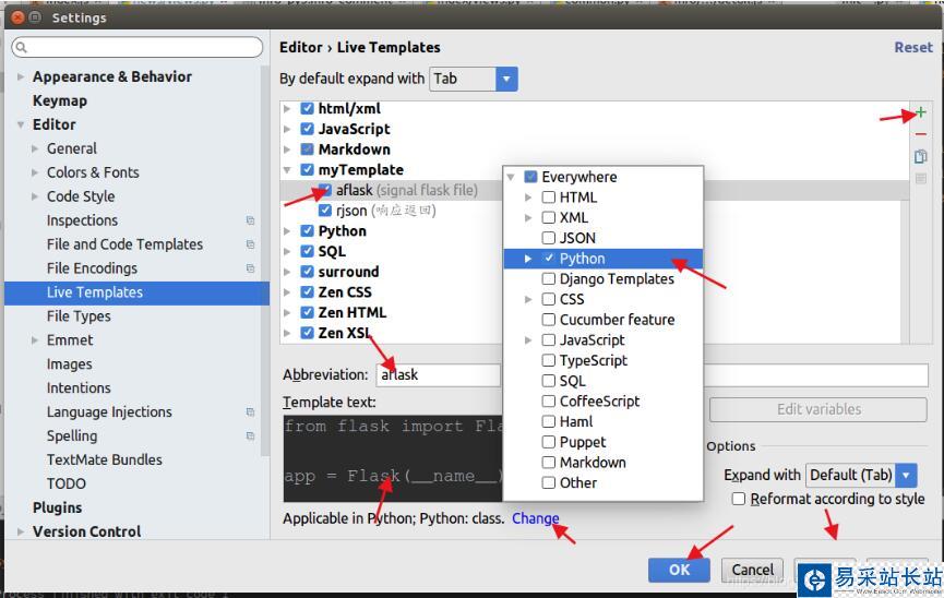添加常用的模塊 +(Live Template) ,如我把下面的模塊添加為aflask: