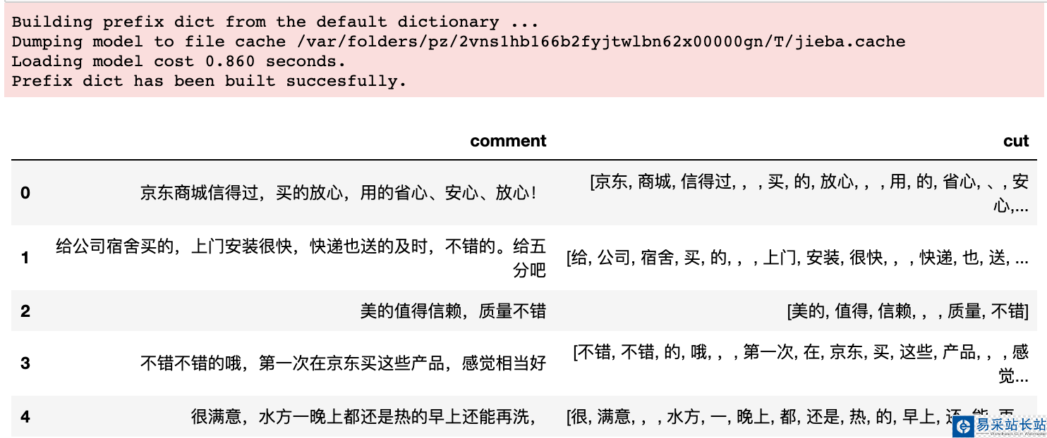 # 生成分詞data['cut'] = data['comment'].apply(lambda x : list(jieba.cut(x)))data.head()