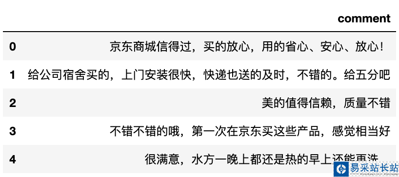 # 導入相關庫import pandas as pdimport jieba# 讀取數據data = pd.read_csv('meidi_jd.csv', encoding='gb18030')# 查看數據data.head()