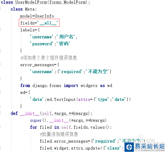 from django.forms import ModelFormfrom django.forms import widgets as wdfrom app01 import modelsclass 類名(ModelForm): class Meta: model = models.表名 #models中的表名 fields="__all__", # 字段 exclude=None, # 排除字段 widgets=None, # 自定義插件 error_messages=None, # 自定義錯誤信息(整體錯誤信息from django.core.exceptions import NON_FIELD_ERRORS) def clean_字段名 #自定義鉤子函數(shù)