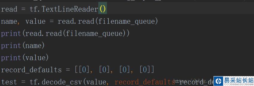 Reader的功能是讀取數據記錄,Decoder的功能是將數據的記錄轉化為張量格式。在使用時需要先創建輸入數據文件對應的Reader,然后從文件名隊列中取出文件名,在調用Reader.read的方法返回一個類似于(輸入文件名,數據記錄)的元組。最后使用Decoder方法將每一列數據都轉化為張量的形式。