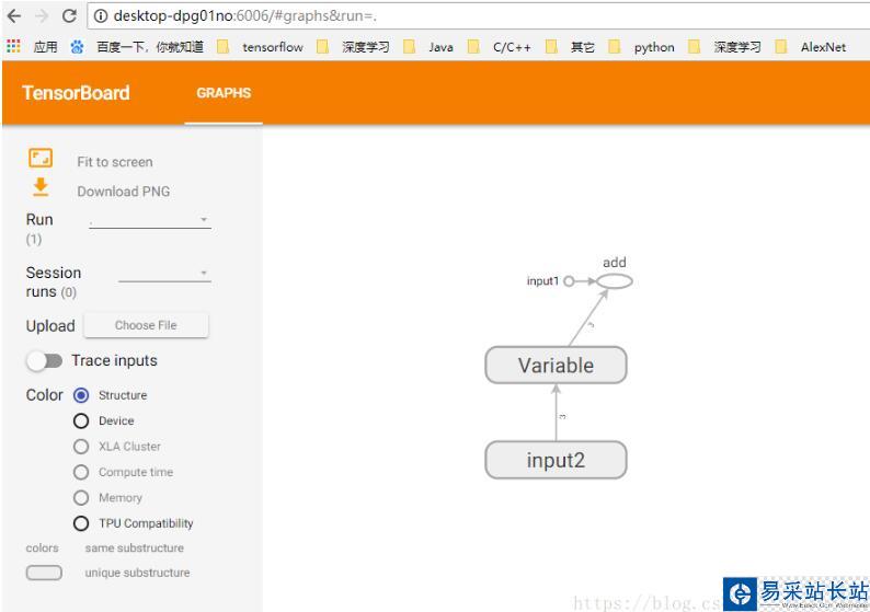 import tensorflow as tf input1 = tf.constant([1.0, 2.0, 3.0], name="input1") input2 = tf.Variable(tf.random_uniform([3], name="input2")) output = tf.add_n([input1, input2], name="add") writer = tf.summary.FileWriter("./log", tf.get_default_graph()) writer.close()"./log":TensorBoard日志信息文件保存的位置,本代碼中表示:把文件保存把在當(dāng)前目錄下的"log"文件夾下。