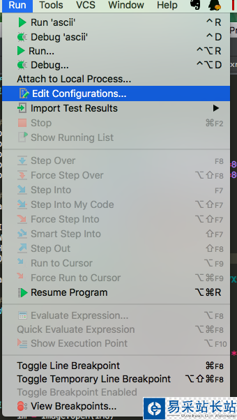 在PyCharm中選擇'Run'->Edit Configurations,如下圖