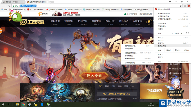 百度"王者榮耀"進入官網 https://pvp.qq.com/。這里以Goole Chrome瀏覽器為例,在更多工具中選擇開發者工具,或直接按F12進入調試界面,然后按F5刷新界面