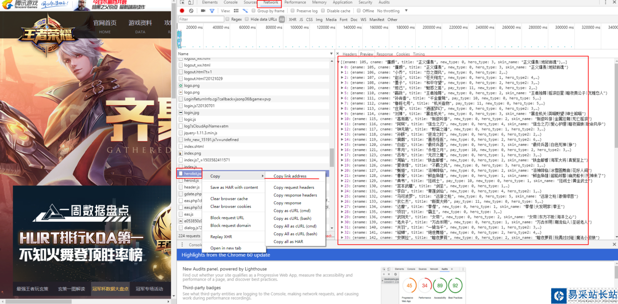 圖中標識的herolist.json文件就是我們所需要的英雄列表,其中包括英雄編號、英雄名稱、英雄類型、皮膚的名稱等信息,在文件上右擊復制鏈接,http://pvp.qq.com/web201605/js/herolist.json