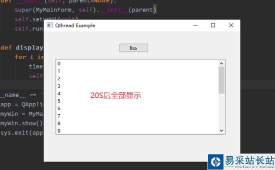 # -*- coding: utf-8 -*-import sysimport timefrom PyQt5.QtCore import QThread, pyqtSignalfrom PyQt5.QtWidgets import QApplication, QMainWindowfrom QThread_Example_UI import Ui_Formclass MyMainForm(QMainWindow, Ui_Form): def __init__(self, parent=None): super(MyMainForm, self).__init__(parent) self.setupUi(self) self.runButton.clicked.connect(self.display) def display(self): for i in range(20): time.sleep(1) self.listWidget.addItem(str(i))if __name__ == "__main__": app = QApplication(sys.argv) myWin = MyMainForm() myWin.show() sys.exit(app.exec_())