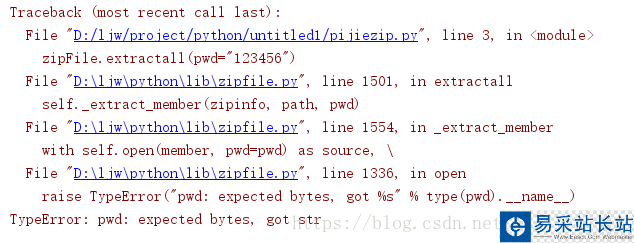 import zipfile zipFile = zipfile.ZipFile("q.zip","r")//這里是我們的壓縮文件 zipFile.extractall(pwd="123456")//這里是我們的密碼 這段代碼其實就是拿著密碼去解壓我們剛剛壓縮的文件,網上大多數教程都是這樣寫的,但是我這邊使用python3.6就會發現運行的時候報錯了