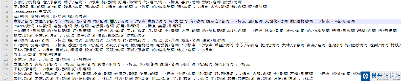 #encoding=utf-8 ############################# # # 功能:給定一些中文的產(chǎn)品評論,希望從中找到評價對象及評價詞。 # # @author:licl # ############################## fdata = open('JD_DFB_comments_out.txt','r') Output = open('Pattern_Result.txt','a') try: data = fdata.readlines() listline = [] for line in data: listline = line.replace(" ","/") listline = listline.split("/") i = 1 while i < len(listline): if listline[i] != "名詞": i = i+2 else: new_list = ["","",""] new_list[0] = listline[i-1] a = i-1 i = i+2 while i < len(listline): if listline[i] == "標(biāo)點": i = i+2 break else: if listline[i-1]=='不' or listline[i-1]=='不怎么樣' or listline[i-1]=='不怎么' or listline[i-1]=='不太': new_list[1] = listline[i-1] if listline[i] == "形容詞" or listline[i] == "形謂詞": new_list[1] += listline[i-1] b = i-1 t = (b-a)/2 new_list[2] = str(t) for line in new_list: Output.write(line + " ") Output.write("/n") break else: i = i+2 except: print "‘文件不存在'或者‘文件無法打開'" finally: fdata.close() Output.close() 以上就是本文的全部內(nèi)容,希望對大家的學(xué)習(xí)有所幫助,也希望大家多多支持武林站長站。