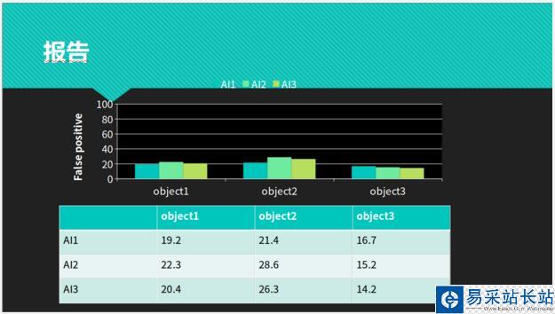 from pptx import Presentationfrom pptx.util import Inchesfrom pptx import Presentationfrom pptx.chart.data import ChartDatafrom pptx.enum.chart import XL_CHART_TYPEfrom pptx.util import Cm #Inchesfrom pptx.enum.chart import XL_LEGEND_POSITIONif __name__ == '__main__': # 創(chuàng)建幻燈片 ------ prs = Presentation('template.pptx') title_only_slide_layout = prs.slide_layouts[5] slide = prs.slides.add_slide(title_only_slide_layout) shapes = slide.shapes shapes.title.text = '報(bào)告' # 定義表格數(shù)據(jù) ------ name_objects = ["object1", "object2", "object3"] name_AIs = ["AI1", "AI2", "AI3"] val_AI1 = (19.2, 21.4, 16.7) val_AI2 = (22.3, 28.6, 15.2) val_AI3 = (20.4, 26.3, 14.2) val_AIs = [val_AI1, val_AI2, val_AI3] # 表格樣式 -------------------- rows = 4 cols = 4 top = Cm(12.5) left = Cm(3.5) #Inches(2.0) width = Cm(24) # Inches(6.0) height = Cm(6) # Inches(0.8) # 添加表格到幻燈片 -------------------- table = shapes.add_table(rows, cols, left, top, width, height).table # 設(shè)置單元格寬度 table.columns[0].width = Cm(6)# Inches(2.0) table.columns[1].width = Cm(6) table.columns[2].width = Cm(6) table.columns[3].width = Cm(6) # 設(shè)置標(biāo)題行 table.cell(0, 1).text = name_objects[0] table.cell(0, 2).text = name_objects[1] table.cell(0, 3).text = name_objects[2] # 填充數(shù)據(jù) table.cell(1, 0).text = name_AIs[0] table.cell(1, 1).text = str(val_AI1[0]) table.cell(1, 2).text = str(val_AI1[1]) table.cell(1, 3).text = str(val_AI1[2]) table.cell(2, 0).text = name_AIs[1] table.cell(2, 1).text = str(val_AI2[0]) table.cell(2, 2).text = str(val_AI2[1]) table.cell(2, 3).text = str(val_AI2[2]) table.cell(3, 0).text = name_AIs[2] table.cell(3, 1).text = str(val_AI3[0]) table.cell(3, 2).text = str(val_AI3[1]) table.cell(3, 3).text = str(val_AI3[2]) # 定義圖表數(shù)據(jù) --------------------- chart_data = ChartData() chart_data.categories = name_objects chart_data.add_series(name_AIs[0], val_AI1) chart_data.add_series(name_AIs[1], val_AI2) chart_data.add_series(name_AIs[2], val_AI3) # 添加圖表到幻燈片 -------------------- x, y, cx, cy = Cm(3.5), Cm(4.2), Cm(24), Cm(8) graphic_frame = slide.shapes.add_chart( XL_CHART_TYPE.COLUMN_CLUSTERED, x, y, cx, cy, chart_data ) chart = graphic_frame.chart chart.has_legend = True chart.legend.position = XL_LEGEND_POSITION.TOP chart.legend.include_in_layout = False value_axis = chart.value_axis value_axis.maximum_scale = 100.0 value_axis.has_title = True value_axis.axis_title.has_text_frame = True value_axis.axis_title.text_frame.text = "False positive" value_axis.axis_title.text_frame.auto_size prs.save('test_template.pptx')