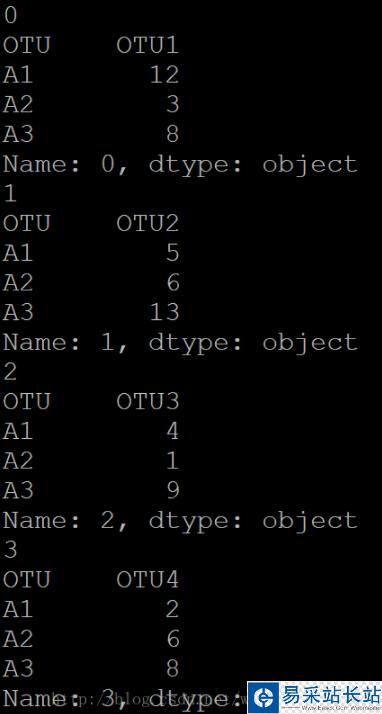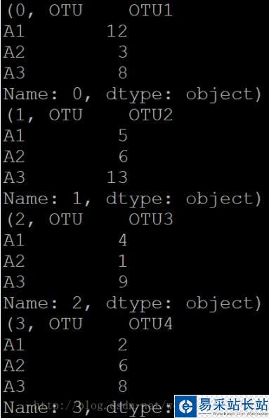 import pandas as pdotu = pd.read_csv("otu.txt",sep="/t")for row in otu.iterrows(): print row那么row就是整個元組。輸出結果可以看出: