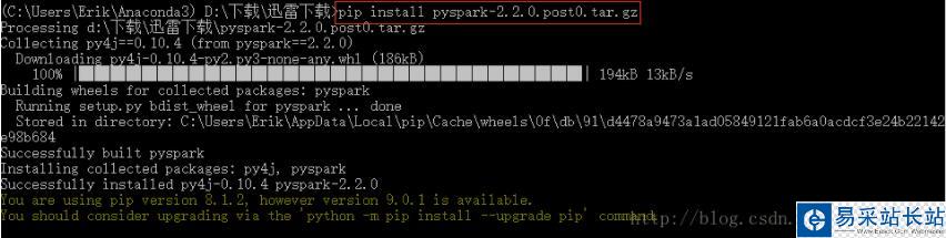 提示出現“Successfully installed py4j-0.10.4 pyspark-2.2.0”時就說明安裝成功了,這時就安裝好了,可以使用了。