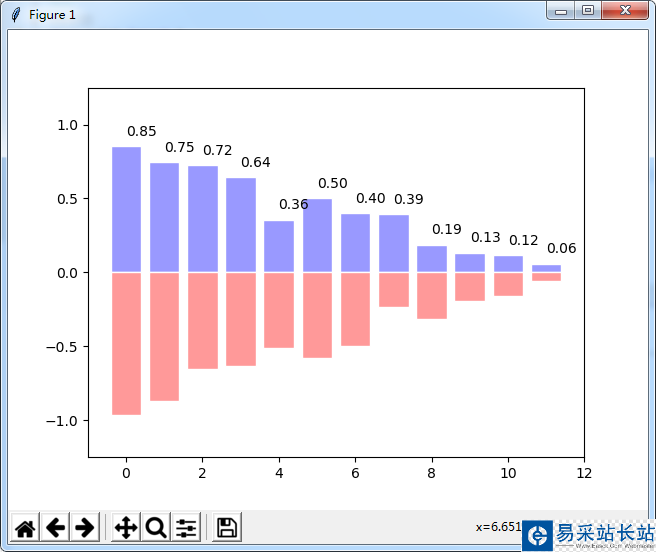 #條形圖from pylab import *n = 12X = np.arange(n)Y1 = (1-X/float(n)) * np.random.uniform(0.5,1.0,n)Y2 = (1-X/float(n)) * np.random.uniform(0.5,1.0,n)bar(X, +Y1, facecolor='#9999ff', edgecolor='white')bar(X, -Y2, facecolor='#ff9999', edgecolor='white')for x,y in zip(X,Y1): text(x+0.4, y+0.05, '%.2f' % y, ha='center', va= 'bottom')ylim(-1.25,+1.25)show()