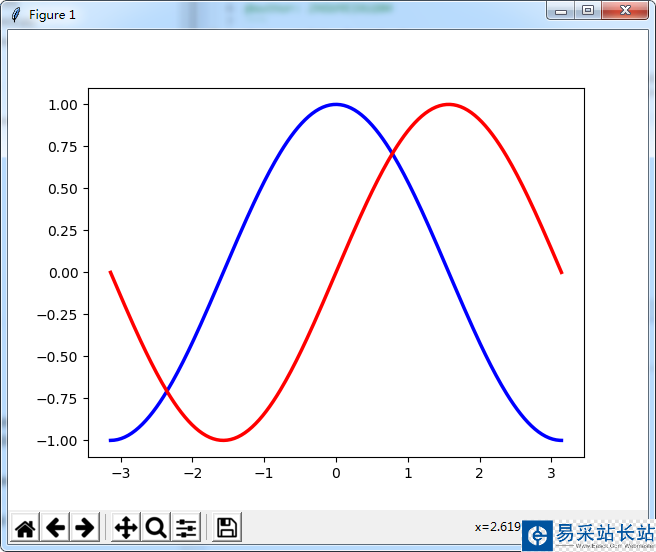# 畫簡單的圖形from pylab import *x=np.linspace(-np.pi,np.pi,256,endpoint=True)c,s=np.cos(x),np.sin(x)plot(x,c, color="blue", linewidth=2.5, linestyle="-", label="cosine") #label用于標簽顯示問題plot(x,s,color="red", linewidth=2.5, linestyle="-", label="sine")show()