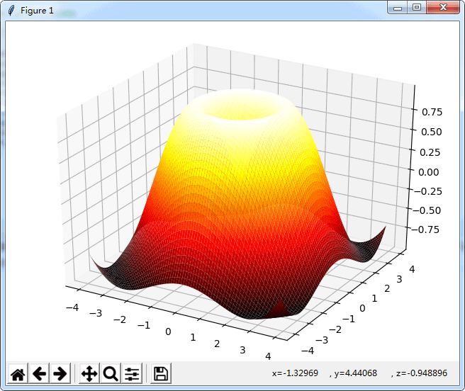 #畫三維圖import numpy as npfrom mpl_toolkits.mplot3d import Axes3Dfrom pylab import *fig=figure()ax=Axes3D(fig)x=np.arange(-4,4,0.1)y=np.arange(-4,4,0.1)x,y=np.meshgrid(x,y)R=np.sqrt(x**2+y**2)z=np.sin(R)ax.plot_surface(x,y,z,rstride=1,cstride=1,cmap='hot')show()