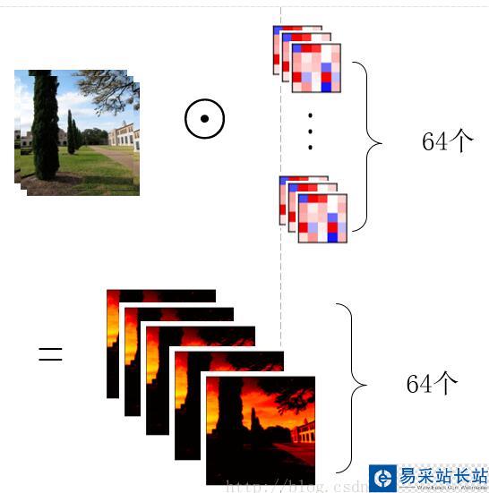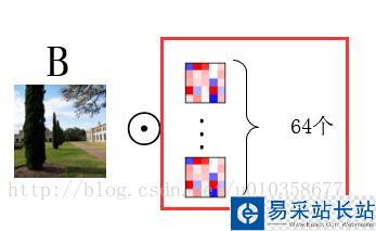 那么用一組(64個)卷積核去卷積一幅圖像,得到64個feature map就如下圖所示,也就是每個卷積核得到一個feature map,64個卷積核就得到64個feature map。