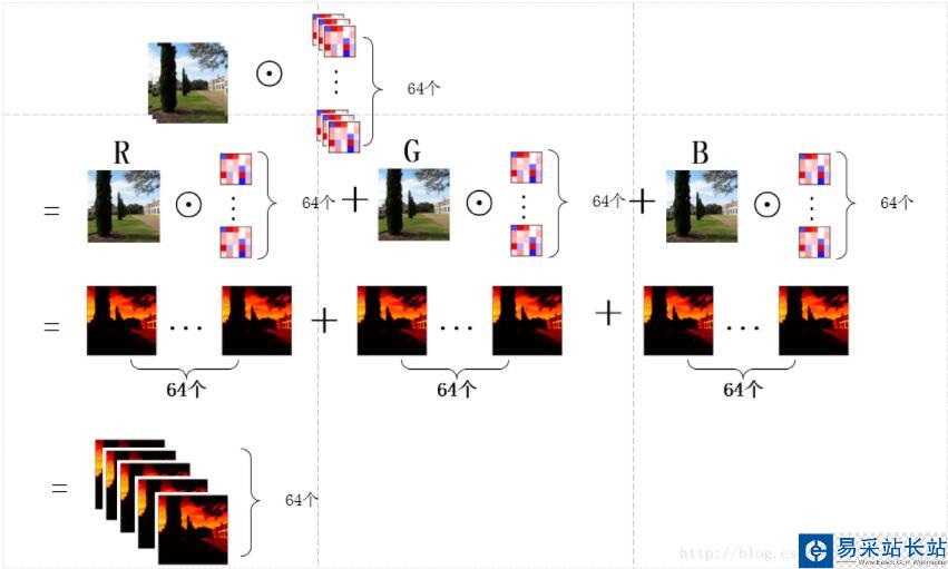 另外,也可以稍微換一個角度看待這個問題,那就是先讓圖片的某一通道分別與64個卷積核的對應通道做卷積,得到64個feature map的中間結果,之后3個通道對應的中間結果再相加,得到最終的feature map,如下圖所示: