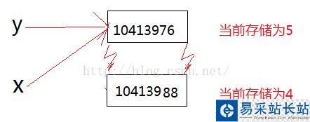 也就是說在執(zhí)行x = 4,y = 5之后,x,y分別指向了不同的地址,當(dāng)執(zhí)行 x = y之后: