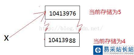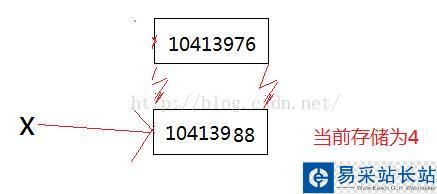 也就是說:開始的時候,x指向了10413988這塊內(nèi)存,里面存儲的是4