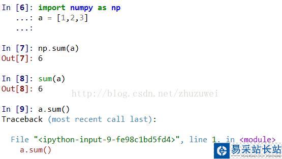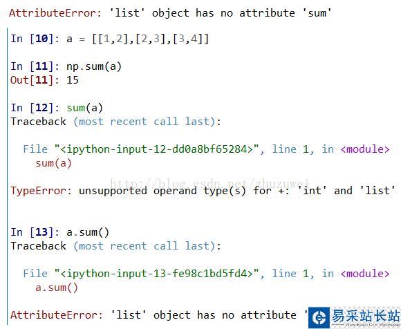 1. 列表使用sum, 如下代碼,對1維列表和二維列表,numpy.sum(a)都能將列表a中的所有元素求和并返回,a.sum()用法是非法的。