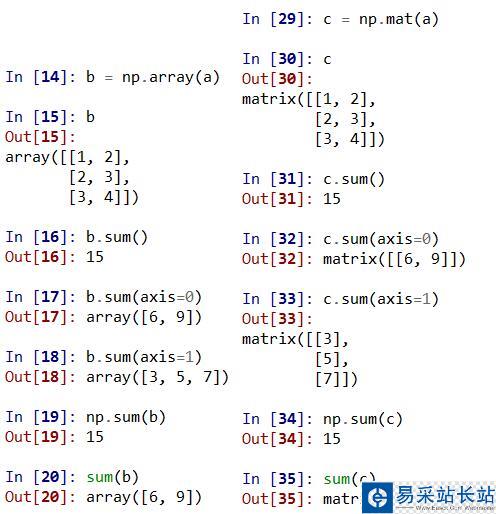 2. 在數組和矩陣中使用sum: 對數組b和矩陣c,代碼b.sum(),np.sum(b),c.sum(),np.sum(c)都能將b、c中的所有元素求和并返回單個數值。