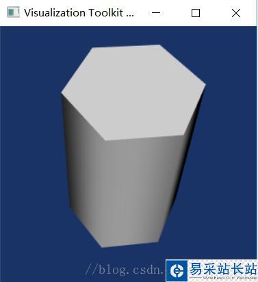 #!/usr/bin/env python import vtk# 參考的C++版本源碼及解釋 感謝原作者# http://blog.csdn.net/www_doling_net/article/details/8536376 def main(): cylinder = vtk.vtkCylinderSource() cylinder.SetHeight(3.0) # 設置柱體的高 cylinder.SetRadius(1.0) # 設置柱體橫截面的半徑 cylinder.SetResolution(6) # 設置柱體橫截面的等邊多邊形的邊數 cylinderMapper = vtk.vtkPolyDataMapper() # 渲染多邊形幾何數據 cylinderMapper.SetInputConnection(cylinder.GetOutputPort()) # VTK可視化管線的輸入數據接口 ,對應的可視化管線輸出數據的接口為GetOutputPort(); cylinderActor = vtk.vtkActor() cylinderActor.SetMapper(cylinderMapper) # 設置生成幾何圖元的Mapper。即連接一個Actor到可視化管線的末端(可視化管線的末端就是Mapper)。 renderer = vtk.vtkRenderer() # 負責管理場景的渲染過程 renderer.AddActor(cylinderActor) renderer.SetBackground(0.1, 0.2, 0.4) renWin = vtk.vtkRenderWindow() # 將操作系統與VTK渲染引擎連接到一起。 renWin.AddRenderer(renderer) renWin.SetSize(300, 300) iren = vtk.vtkRenderWindowInteractor() # 提供平臺獨立的響應鼠標、鍵盤和時鐘事件的交互機制 iren.SetRenderWindow(renWin) # 交互器樣式的一種,該樣式下,用戶是通過控制相機對物體作旋轉、放大、縮小等操作 style = vtk.vtkInteractorStyleTrackballCamera() iren.SetInteractorStyle(style) iren.Initialize() iren.Start() # Clean up del cylinder del cylinderMapper del cylinderActor del renderer del renWin del iren main()