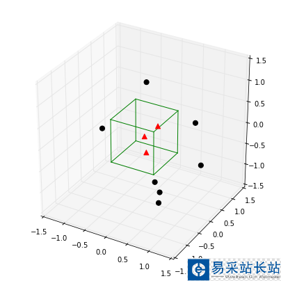 from mpl_toolkits.mplot3d import Axes3Dimport matplotlib.pyplot as pltimport numpy as npfrom itertools import product, combinationsfig = plt.figure(figsize=(7,7))ax = fig.gca(projection='3d')ax.set_aspect("equal")# 畫點 # 立方體里的點X_inside = np.array([[0,0,0],[0.2,0.2,0.2],[0.1, -0.1, -0.3]])X_outside = np.array([[-1.2,0.3,-0.3],[0.8,-0.82,-0.9],[1, 0.6, -0.7], [0.8,0.7,0.2],[0.7,-0.8,-0.45],[-0.3, 0.6, 0.9], [0.7,-0.6,-0.8]])for row in X_inside: ax.scatter(row[0], row[1], row[2], color="r", s=50, marker='^')for row in X_outside: ax.scatter(row[0], row[1], row[2], color="k", s=50)# 畫立方體h = [-0.5, 0.5]for s, e in combinations(np.array(list(product(h,h,h))), 2): if np.sum(np.abs(s-e)) == h[1]-h[0]: ax.plot3D(*zip(s,e), color="g")ax.set_xlim(-1.5, 1.5)ax.set_ylim(-1.5, 1.5)ax.set_zlim(-1.5, 1.5)plt.show()