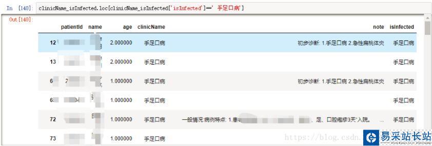 此時(shí),我要選擇列名isInfected為“手足口病”的樣本行: