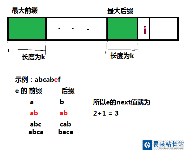 假定最大前綴=最大后綴,長度為k 那么第i位字符,對應的next值就為k+1,一次循環(huán)就能求出每個字符的next值