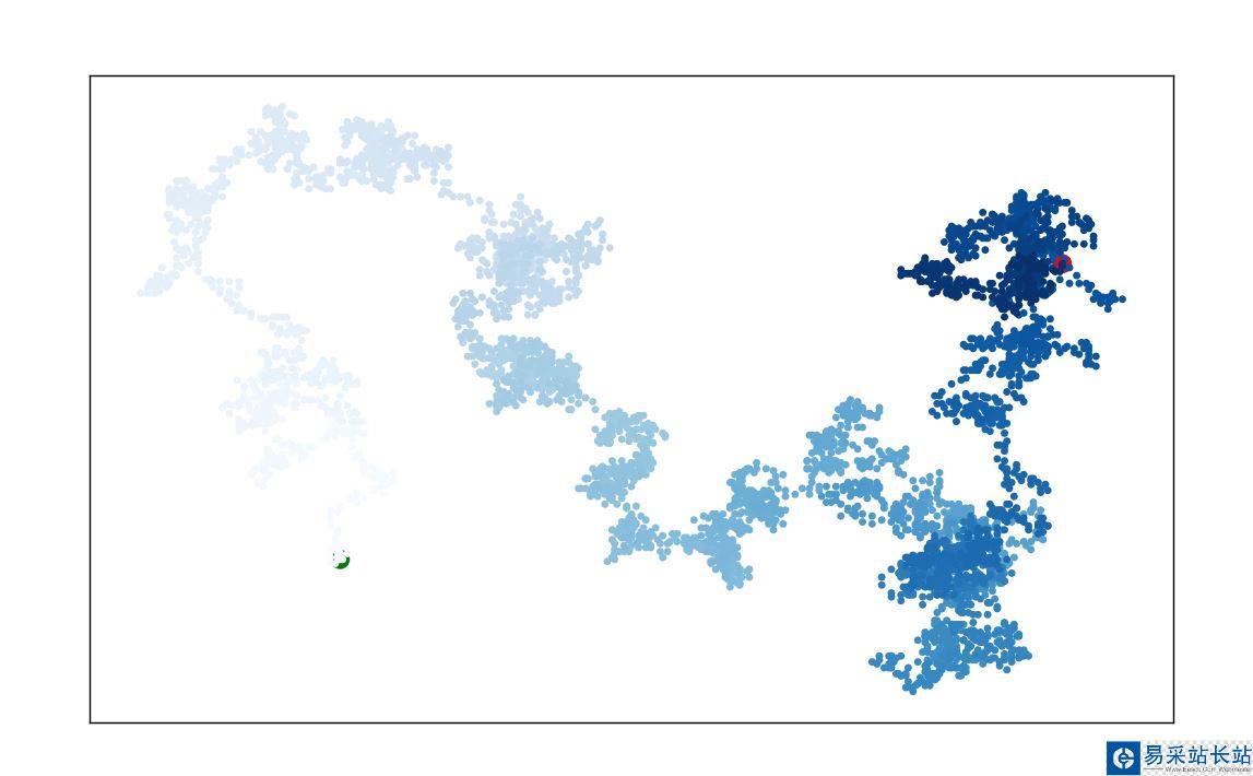import matplotlib.pyplot as pltfrom random_walk import Randomwalkfrom random import choicewhile True: rw = Randomwalk() rw.fill_walk() #設(shè)置繪畫窗口大小 plt.figure(dpi=128,figsize=(10,6)) point_numbers = list(range(rw.num_point)) #突出起點(0,0)和終點 plt.scatter(0,0,c='green',edgecolors='none',s=100) plt.scatter(rw.x_lab[-1],rw.y_lab[-1],c='red',edgecolors='none',s=100) #隱藏坐標(biāo)軸 plt.axes().get_xaxis().set_visible(False) plt.axes().get_yaxis().set_visible(False) plt.scatter(rw.x_lab,rw.y_lab,c=point_numbers,cmap=plt.cm.Blues,edgecolors='none',s=15) plt.show() keep_running = input("Make another walk?(y/n): ") keep_running = keep_running.lower() if keep_running == 'n': break5、展示效果