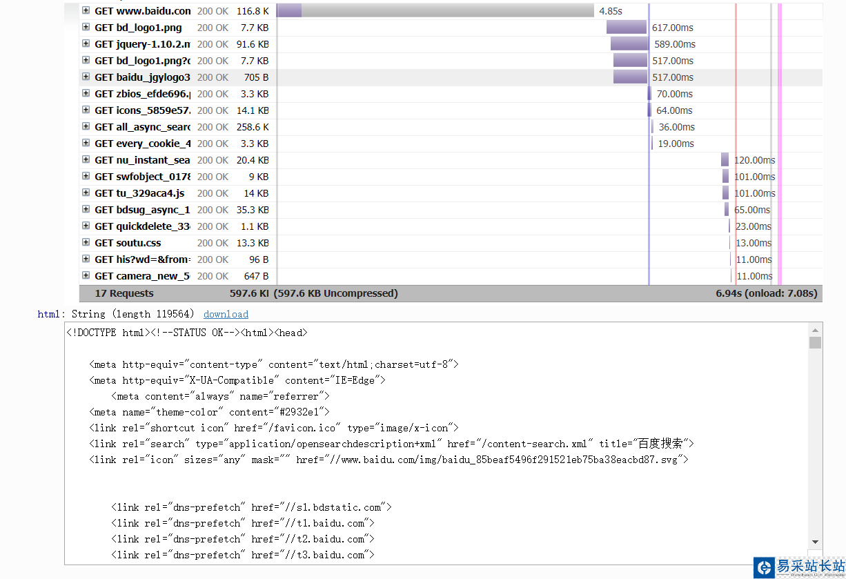 上面有個輸入框,默認是http://google.com,我們可以換成想要渲染的網頁如:https://www.baidu.com然后點擊Render me按鈕開始渲染,頁面返回結果包括渲染截圖、HAR加載統計數據、網頁源代碼: