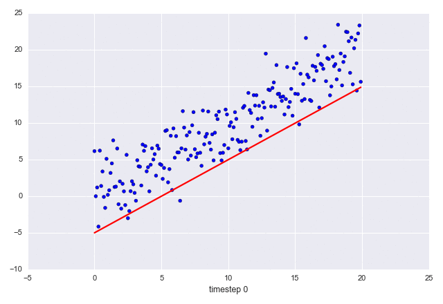 import sysimport numpy as npimport matplotlib.pyplot as pltfrom matplotlib.animation import FuncAnimationfig, ax = plt.subplots()fig.set_tight_layout(True)# 詢問圖形在屏幕上的大小和DPI(每英寸點數)# 注意當把圖形保存為文件時,需要為此單獨再提供一個DPIprint('fig size: {0} DPI, size in inches {1}'.format( fig.get_dpi(), fig.get_size_inches()))# 繪制一個保持不變(不會被重新繪制)的散點圖以及初始直線x = np.arange(0, 20, 0.1)ax.scatter(x, x + np.random.normal(0, 3.0, len(x)))line, = ax.plot(x, x - 5, 'r-', linewidth=2)def update(i): label = 'timestep {0}'.format(i) print(label)# 更新直線和軸(用一個新X軸標簽) # 以元組形式返回這一幀需要重新繪制的物體 line.set_ydata(x - 5 + i) ax.set_xlabel(label) return line, axif __name__ == '__main__': # 會為每一幀調用Update函數 # 這里FunAnimation設置一個10幀動畫,每幀間隔200ms anim = FuncAnimation(fig, update, frames=np.arange(0, 10), interval=200) if len(sys.argv) > 1 and sys.argv[1] == 'save': anim.save('line.gif', dpi=80, writer='imagemagick') else: # Plt.show()會一直循環動畫 plt.show()如果你想換個再酷炫點的主題,可以用seaborn庫,只需添加: