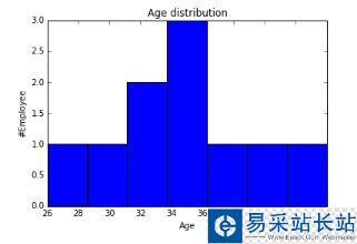 fig=plt.figure() #Plots in matplotlib reside within a figure object, use plt.figure to create new figure#Create one or more subplots using add_subplot, because you can't create blank figureax = fig.add_subplot(1,1,1)#Variableax.hist(df['Age'],bins = 7) # Here you can play with number of binsLabels and Titplt.title('Age distribution')plt.xlabel('Age')plt.ylabel('#Employee')plt.show()