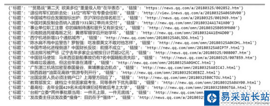 # select method import requests from bs4 import BeautifulSoup headers = {'User-Agent': 'Mozilla/5.0 (Windows NT 10.0; Win64; x64) AppleWebKit/537.36 (KHTML, like Gecko) Chrome/64.0.3282.119 Safari/537.36'} url = 'http://news.qq.com/' Soup = BeautifulSoup(requests.get(url=url, headers=headers).text.encode("utf-8"), 'lxml') em = Soup.select('em[class="f14 l24"] a') for i in em: title = i.get_text() link = i['href'] print({'標(biāo)題': title, '鏈接': link })很常規(guī)的處理方式,抓取效果如下:
