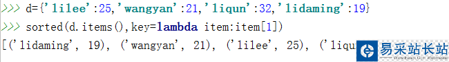 這里的d.items()實際上是將d轉(zhuǎn)換為可迭代對象,迭代對象的元素為 (‘lilee',25)、(‘wangyan',21)、(‘liqun',32)、(‘lidaming',19),items()方法將字典的元素 轉(zhuǎn)化為了元組,而這里key參數(shù)對應(yīng)的lambda表達(dá)式的意思則是選取元組中的第二個元素作為比較參數(shù)(如果寫作key=lambda item:item[0]的話則是選取第一個元素作為比較對象,也就是key值作為比較對象。lambdax:y中x表示輸出參數(shù),y表示lambda 函數(shù)的返回值),所以采用這種方法可以對字典的value進(jìn)行排序。注意排序后的返回值是一個list,而原字典中的名值對被轉(zhuǎn)換為了list中的元組。