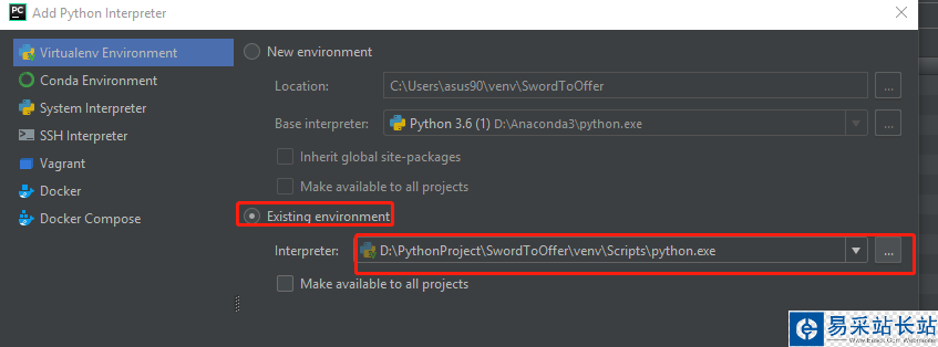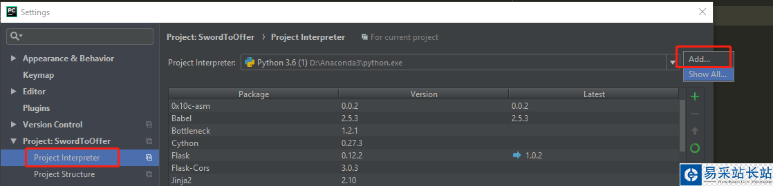 接著是在pycharm中配置anaconda,很多博客寫的比較模糊,我自己嘗試了下,重新整理了下配置流程。打開File-->Settings-->Project Interpreter,勾選圖中圈中按鈕。