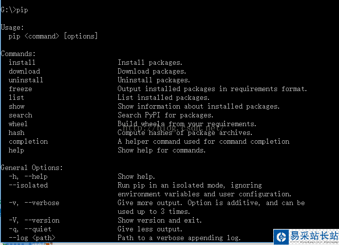 4. pip安裝成功后,在cmd下執(zhí)行pip,將會有如下提示。