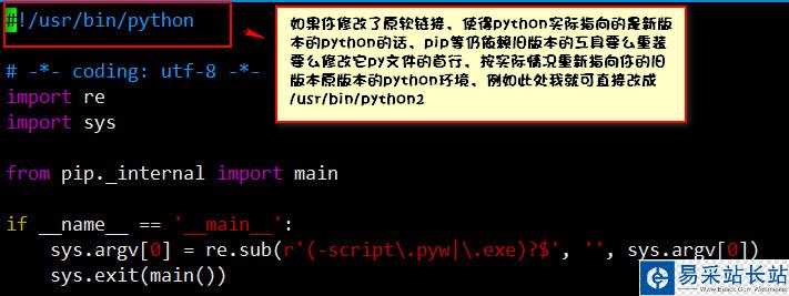 如果你修改了原軟鏈接,使得python實(shí)際指向的是新版本的python的話,pip等仍依賴舊版本的工具要么重裝要么修改它py文件的首行,按實(shí)際情況重新指向你的舊版本原版本的python環(huán)境,例如此處我就可直接改成/usr/bin/python2