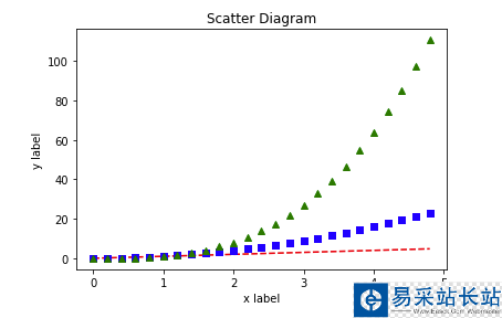 import numpy as npimport matplotlib.pyplot as pltx = np.arange(0., 5., 0.2)# 紅色破折號, 藍色方塊 ,綠色三角塊plt.plot(x, x, 'r--', x, x**2, 'bs', x, x**3, 'g^')plt.show()